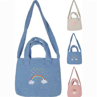 Sac à provisions Enfants, en peluche en fausse fourrure. 3 Design assorti: 1. Sac bleu avec arc-en-ciel avec des points dorés; 2. Sac rose avec de la licorne avec une corne dorée; 3. Off Sac blanc avec cœur rose avec des points dorés, taille 35x30x5cm (taille de poignée non incluse), avec doublure, avec deux poches intérieures, avec fermeture éclair. Chacun avec slogan et ruban, ass.:3 Couleurs (blanc Bluepinkoff)